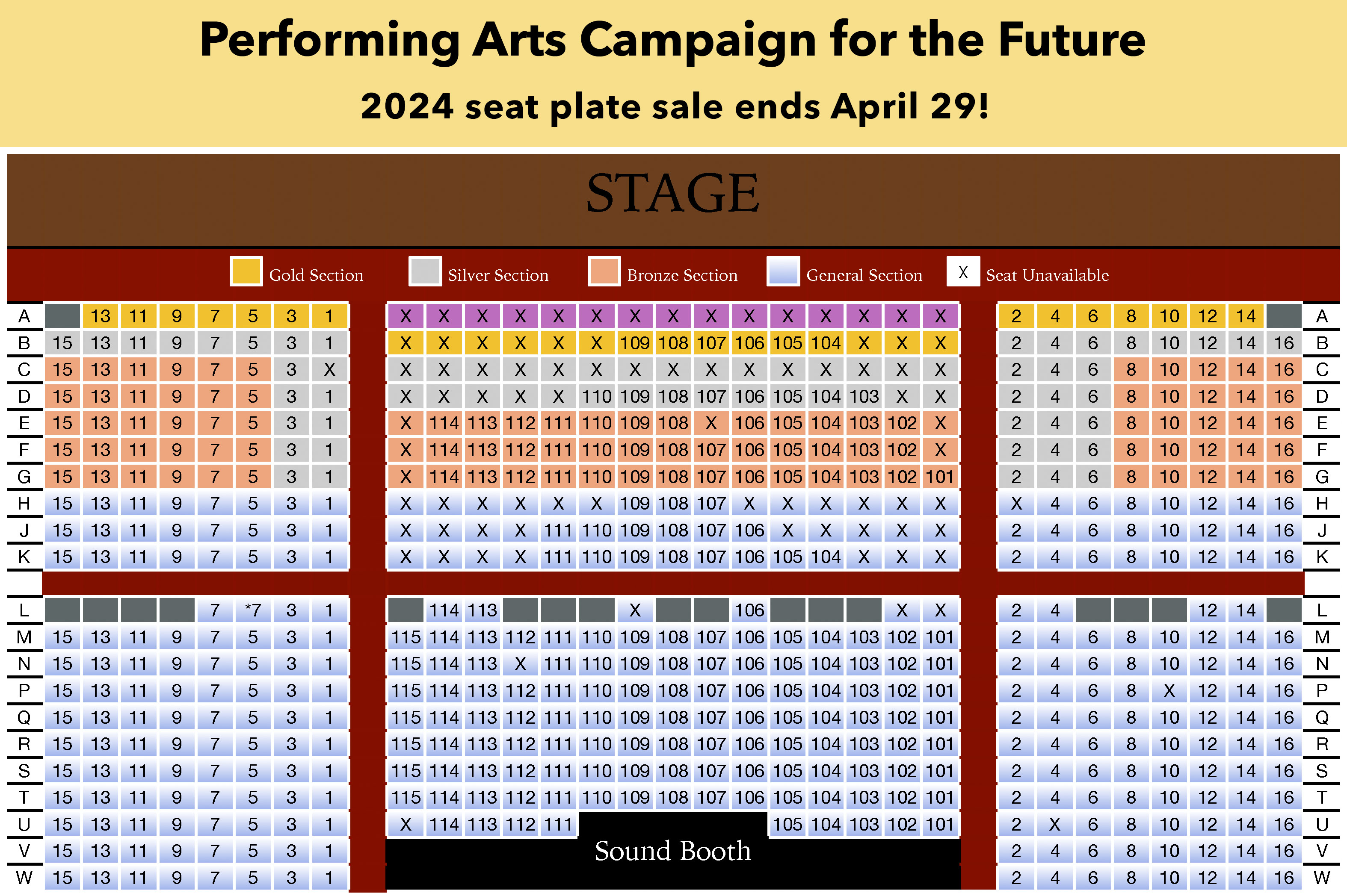 Note on seat plate location: When you purchase your seat plates, you will be asked for your preferred seat location(s). USE THE SEATING CHART IMAGE ABOVE TO PREPARE YOUR CHOICES (Click to enlarge). This chart will not be visible once you are entering information in the order form. Please note that certain rows are reserved for certain donor levels.