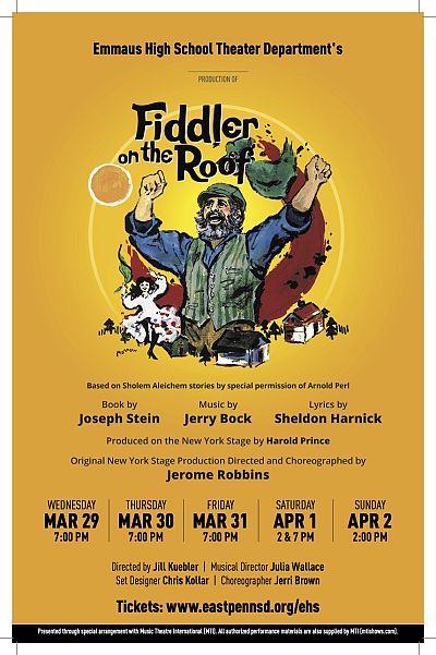 Fiddler on the Roof will be performed from March 29 through April 1 at 7:00 PM, and April 1 and 2 at 2:00 PM in the Emmaus High School Auditorium. We invite you to attend our show to enjoy an affordable evening of theater, and to see that your support is going to a group of very dedicated young artists. Ticket prices are $12.00 for students/seniors and $14.00 for adults.