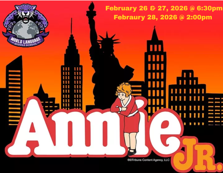 World Language Middle School Presents Annie Jr. Thursday February 26th 6:30PM, Friday February 27th 6:30PM, and Saturday February 28th 2PM