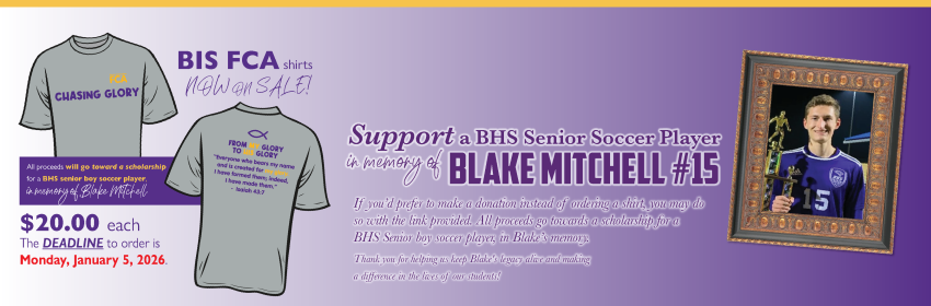 Support a great cause while honoring the memory of Blake Mitchell #15. All proceeds will go toward a scholarship for a BHS senior boy soccer player. Shirts are $20 each — order by Monday, January 5, 2026!