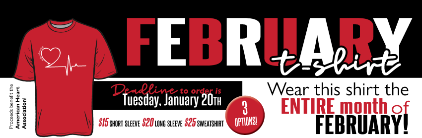Let’s show our support by wearing our RED February T-shirt in support of the American Heart Association.