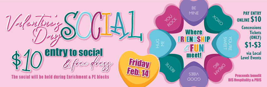 Join us for a fun-filled Valentine’s Day Social where friendship and fun meet! Students will enjoy music and time with friends during Enrichment & PE.